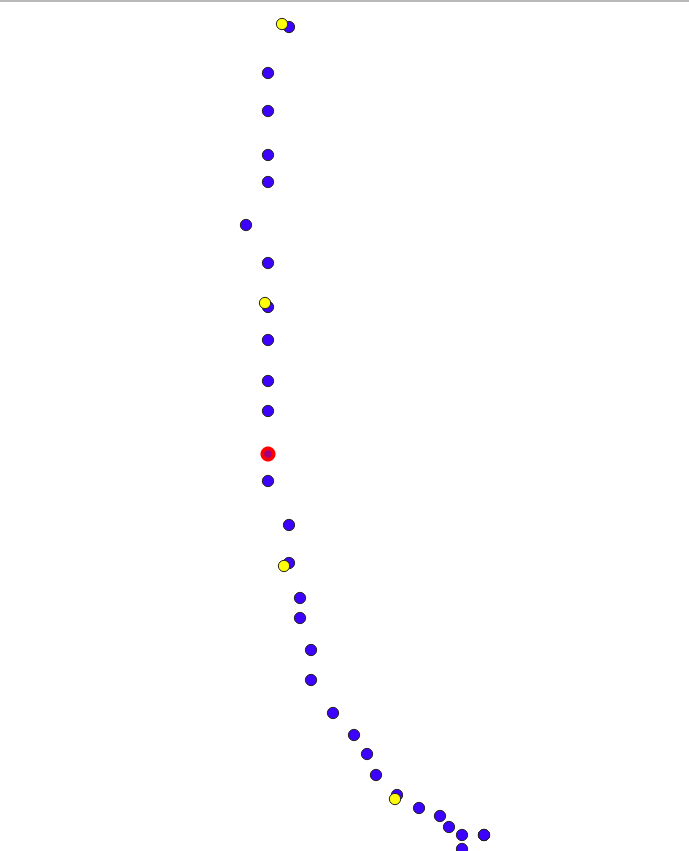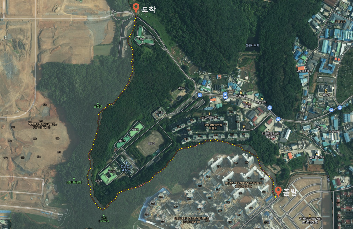 지도의 출발지점을 확대해 보면 위와 같이 선이 아닌 점의 형태입니다. 노란색 점이 램블러에 기록된 GPS 좌표이며 파란색 점이 미밴드7에 기록된 GPS 좌표입니다. 보시다시피 미밴드7에 기록된 GPS 좌표가 램블러에 비해 훨씬 촘촘하게 기록된 것을 알 수 있습니다. (중간에 붉은점도 미밴드7 좌표) 당연히 GPS 거리의 정확도는 램블러에 비해 미밴드가 높을 것입니다.