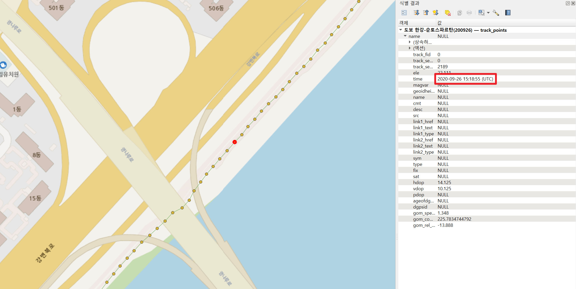 순토 스파르탄 모델로 한강 시민공원을 도보로 이동하면서 생성한 GPX 파일입니다. 연속한 5개의 점을 추출하였고 그 측정 시각은 다음과 같습니다.
