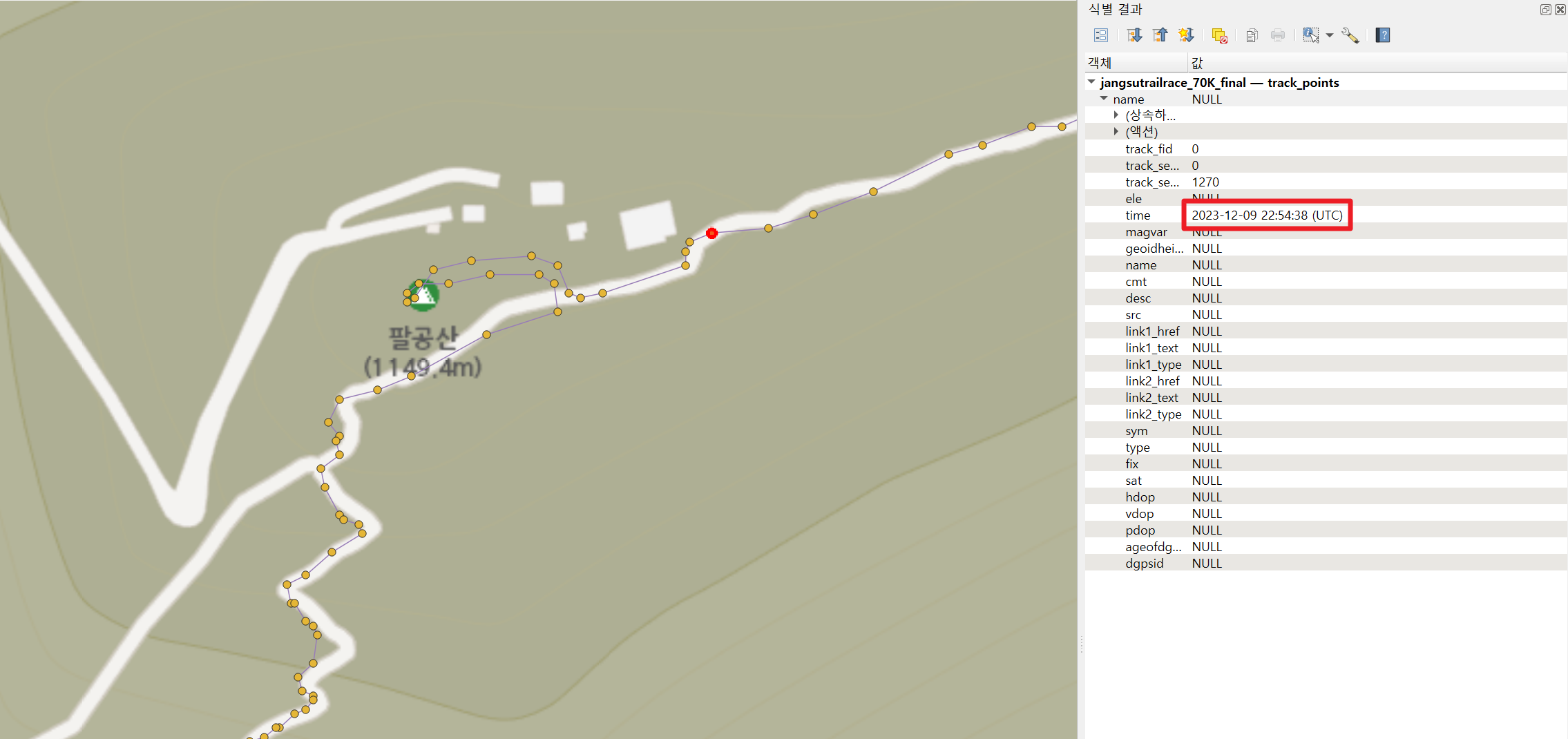 팔공산 산행 시 가민으로 생성한 GPX 파일을 분석한 내용입니다. 연속한 4개 점을 추출하였고 그 측정 시각은 다음과 같습니다.