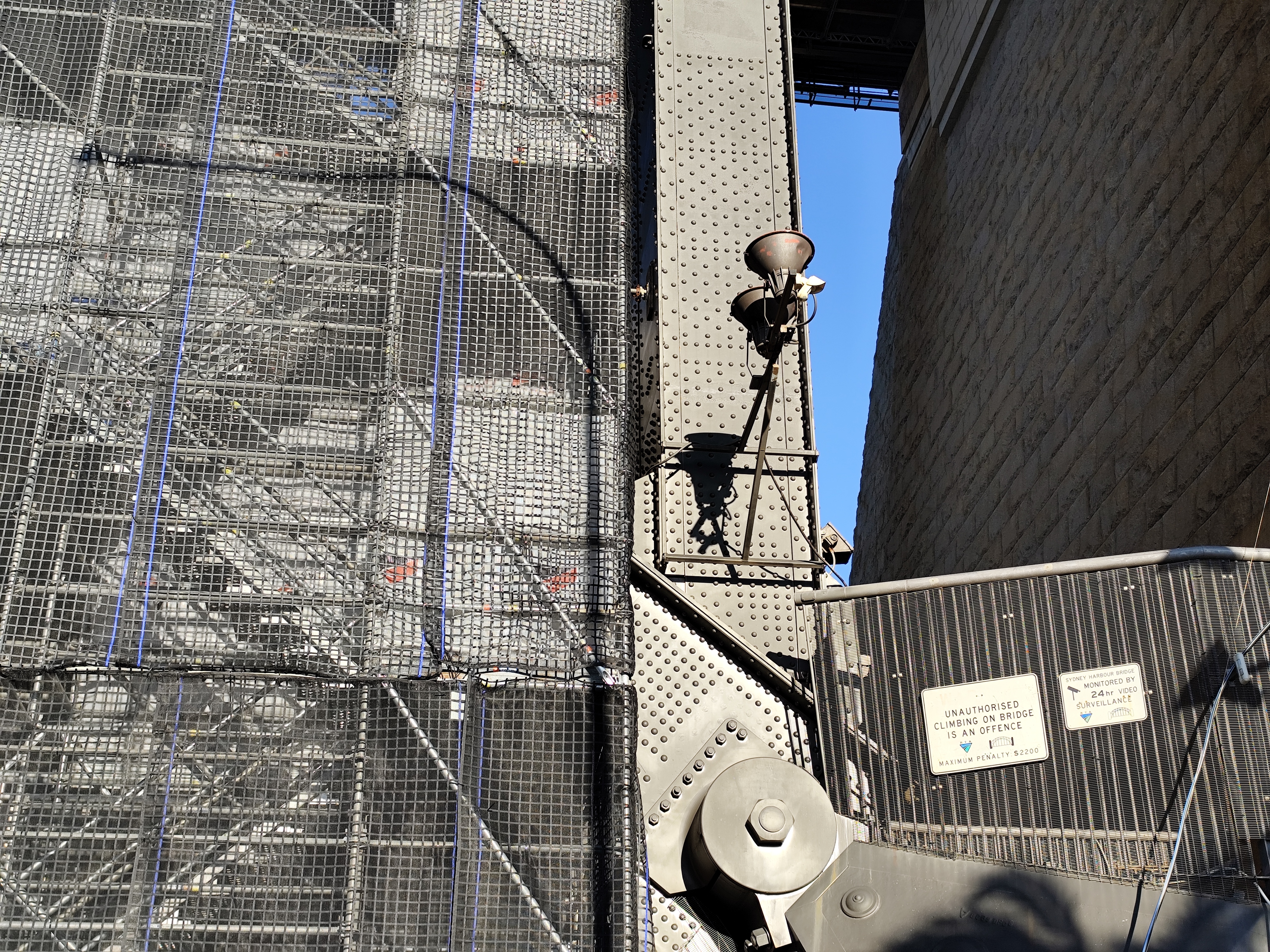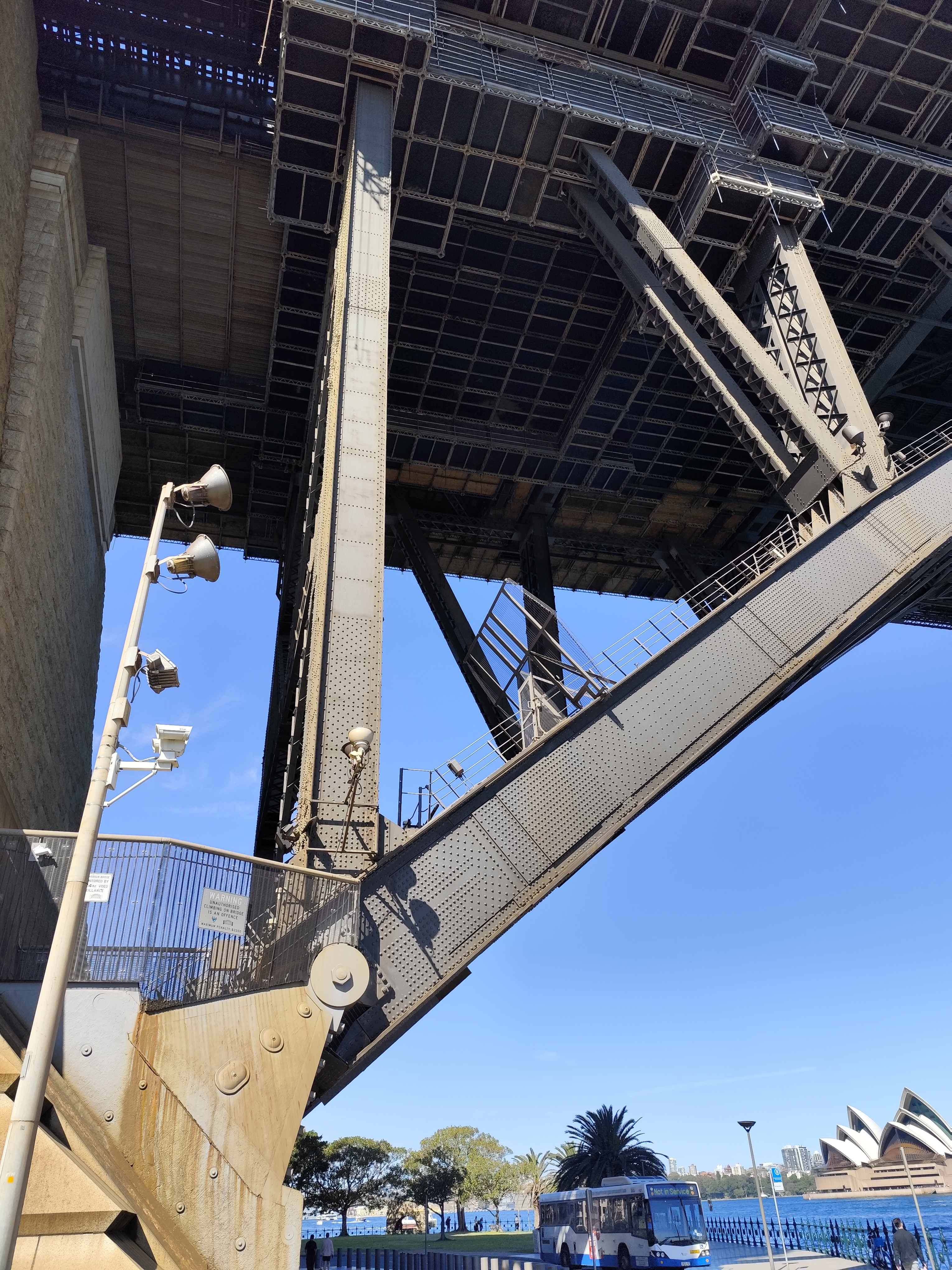 시드니 북부 해변 지역과 남부 서큘러키 지역의 주탑부 하단에 각각 아치의 지점부가 있는데 동그란 힌지가 명확하게 보인다. 박물관에서 확인한 크라운(탑정부) 핀 연결까지 총 3개의 힌지로 연결된 아치교 임을 알 수 있었다. 참고로 서큘러키 지역의 지점부는 보수공사로 인해 비계와 가시설을 설치한 상태였다.