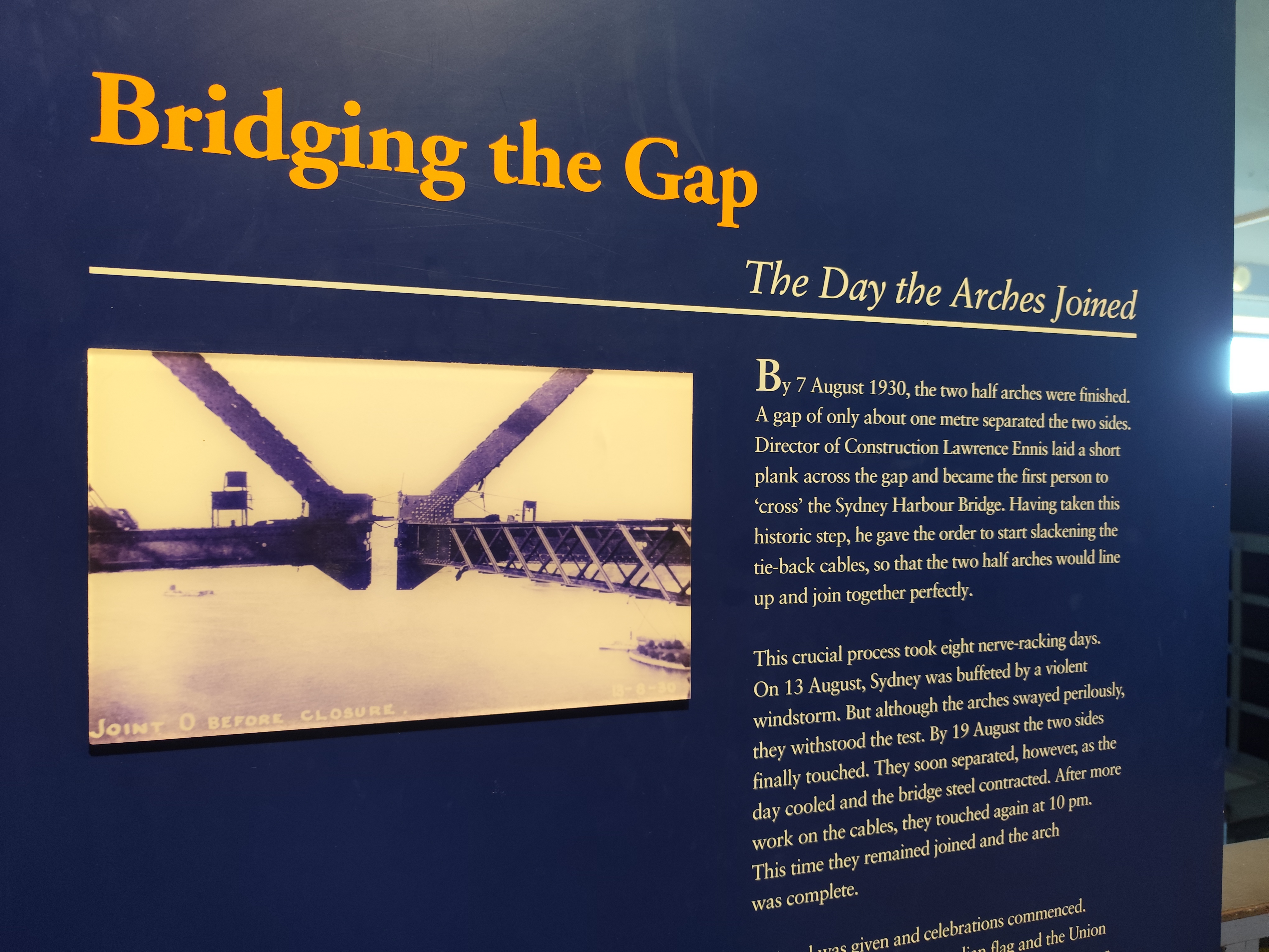 교량으로 올라가보니 측면에서 보던 것과 달리 총 4개의 주탑이 있었는데 시드니 남부 서큘러키(Circular Quay) 쪽 주탑에 작은 박물관을 겸한 전망대가 있다. 그런데 박물관이 유료로 운영되어 하버 브릿지를 걷는 모든 사람이 방문하지는 않는다. 우리나라에서도 장대교량 건설 후 기념관 같은 곳을 운영하는 데가 있는데 교량과 떨어진 주변 지역에 별도의 건물을 지어 운영하지 이렇게 교량 자체에서 운영하는 곳은 보지 못했다.