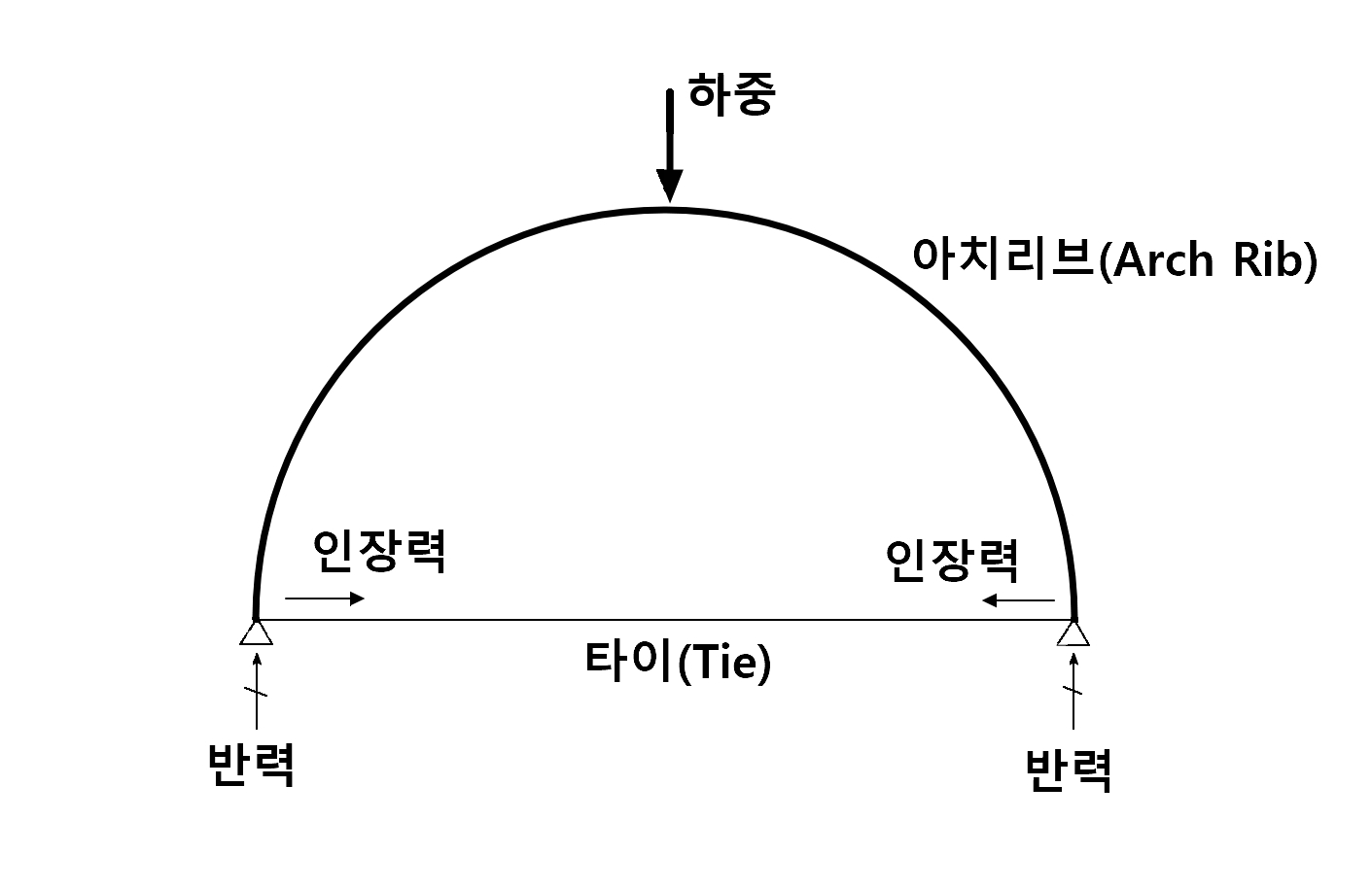 따라서 아치 구조물에 수직하중이 작용하는 경우 지점부에 수평반력이 발생한다. 또한 지점부의 수평반력으로 인해 아치리브에는 압축력이 발생하게 된다.(이것이 아치 구조물을 이해하는 핵심)