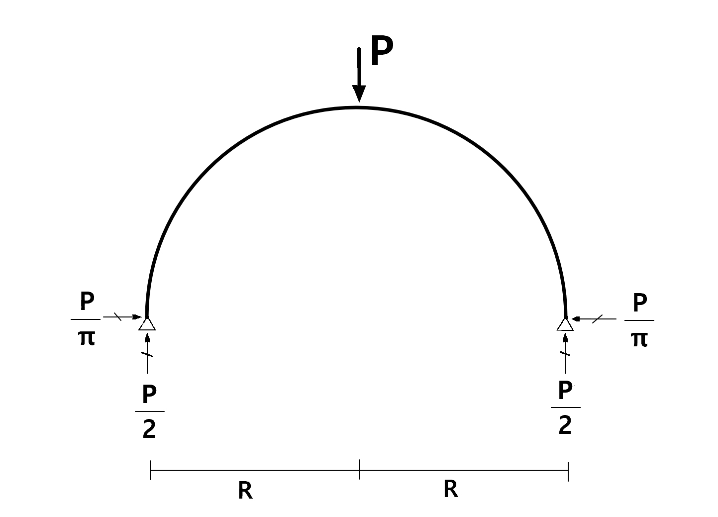 앞서 설명한 반원형 아치의 수평반력을 구하면 위와 같은 결과가 나온다.(계산과정 생략) 수직하중만 존재하는 구조물에 수직반력 말고 수평반력이 생긴다는 것도 신기한데 수평반력의 값이 P/π 라니 오일러의 항등식에 대한 기시감이 드는건 단순히 기분탓이 아닐게다. 게다가 반지름의 크기와 무관하게 항상 수직하중에만 비례하는 값이 나온다는 사실이 그저 놀랍다. 계산해보면 수직반력(P/2 = 0.5P) 보다 약간 작은 값(P/π = 0.318P)이 나온다.