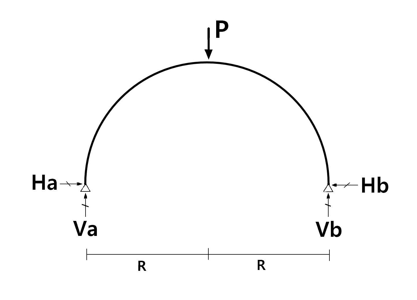 위 그림과 같이 반지름이 R인 반원형 아치의 크라운(Crown)에 수직하중(P)이 작용하는 경우 지점에는 이에 저항하는 수직반력(Va, Vb)이 발생한다. 일반적으로 구조물은 하중을 받을때 평형상태를 유지하지 위해 크기가 같고 방향이 반대인 내력(저항력)이 발생한다. 따라서 수직하중만 구조물에 작용할 경우 지점에는 수직반력(Va, Vb)만 생기는 것이 당연하고, 수평반력(Ha, Hb)은 발생하지 않는다.