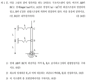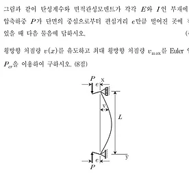분류 전체보기 썸네일형 리스트형 2011년 시행 5급(기술) 공채 구조역학 제2문 (2012. 2. 6.) 2번은 충격(급가)하중에 관한 문제인데 사실 (a)형태야 워낙 유명한 문제이고 공식처럼 외우다시피 하는 분들도 많을테지만 1번 문제와 마찬가지로 최소 전체 포텐셜 에너지 원리만 이해하면 굳이 외우지 않아도 금방 공식을 산정해 낼 수도 있다. 내 풀이는 최소 전체 포텐셜 에너지 원리를 약간 변형해서 중학교시절 배우는 "위치에너지 = 운동에너지"라는 에너지 보존법칙을 이용해 공식을 유도했는데 사실상 동일한 방법이다. (b)형태는 고정지점이 탄성지점으로 변환된 형태라 구조동역학에서 등장하는 스프링 연결의 등가스프링계수를 산정하여 풀이했는데 (c)와 같이 한쪽은 고정지점이고 다른 한쪽은 탄성지점인 형태에서 등가스프링계수를 산정하는데 애를 먹어 한참을 헤매다 해결했다. 다만 충격(급가)하.. 더보기 2011년 시행 5급(기술) 공채 구조역학 제1문 (2012. 2. 6.) 2011년 기술고시 문제는 꽤 오래전에 다운받아 놓고 차일피일 미루고 있다가 96회 시험이 임박한 최근에야 풀어보게 되었다. 몇년간 기술사 공부를 하면서 이문제 저문제 접하다보니 기술고시 문제와 자연스럽게 비교가 되는데 기술사 문제가 정형화된 어려움과 지저분함(?)을 특징으로 한다면 기술고시 문제는 상대적으로 깔끔하지만 한두번 꼬아놓은 수수께끼 같은 어려움과 경시대회 문제같은 참신성이 있다고나 할까? 두 시험별로 자주 출제되는 방향이나 문제도 사실 얼핏보면 유사한듯 하면서도 상당히 많은 차이가 있다. 난이도는 해가 갈수록 기술고시 문제가 점점더 어려워지는 듯 하다. 게다가 일반적으로 학부의 정규 커리큘럼에서 배우는 수준을 넘어 대학원 과정에서나 다루는 토픽도 자주 등장하는 걸 보.. 더보기 삼각방정식 풀이에 관한 팁 (2012. 1. 10.) 지난 주말 탄성안정론 중 기둥의 좌굴에 관한 내용을 공부하다가 삼각방정식 풀이에서 막혔던 부분이 해소되어 기쁜 마음을 주체하지 못하고 포스팅을 한다. 이러한 사실을 원래 알고계신 고수분들에겐 별거 아닌 내용이지만 나처럼 하수 수험생에겐 머리를 아무리 싸매고 연구해도 해결되지 않는 난제이기에 비슷한 처지의 분들에게는 한줄기 빛과 같은 팁이 아닐수 없다. 2010년도 기술고시 구조역학 5번 문제이다. (참고로 W. F. Chen의 Structural Stability라는 책에 이 문제와 거의 비슷한 예제가 있다. 그 예제에는 상하 보의 휨강성이 EI로 주어져 있다.) 궁금증은 이 문제로부터 시작되었다. 작년에 이 문제를 풀고 노트에 정리를 해뒀는데 간만에 다시 풀어보려고 봤더니 감.. 더보기 건축구조기술사 111회 4교시 6번 (2017. 2. 8.) 건축구조기술사 111회 4교시 6번 문제는 편심하중이 존재하는 기둥의 해석에 관한 문제입니다. 편심이 발생하거나 초기 결함이 있는 불완전한 기둥에 관한 내용은 거의 모든 안정론 책에 기본 예제로 등장하는데 특히 편심하중이 존재하는 기둥의 경우 'Secant 공식'이라고 해서 거의 공식화 되어있고 기술사 시험에도 몇번 출제된 적이 있습니다. 과거에는 미분방정식의 경계조건을 통해 미지수를 산정하는 것과 최대 처짐을 계산하는 과정에서 삼각함수의 변환에 관한 부분을 거의 외우다시피 해야만 원하는 답을 얻을 수 있었고, 실제 몇몇 책에는 그 과정에 대해 상세히 기록해 놓기도 했지만 요즘 CAS 기능이 있는 계산기는 그러한 것을 굳이 외우지 않아도 알아서 계산해주니 편리합니다. 최근 Sec.. 더보기 건축구조기술사 111회 4교시 3번 (2017. 2. 7.) 건축구조기술사 111회 4교시 3번 문제는 수평강성과 주기에 관한 구조동역학 문제입니다. (a) 구조물과 (b) 구조물의 수평강성(k)이 동일하다는 것이 키포인트로 풀이를 보면 알겠지만 1교시에 출제되어도 될만큼 쉽고 간단한 문제입니다. 더보기 건축구조기술사 111회 3교시 2번 (2017. 2. 6.) 건축구조기술사 111회 3교시 2번 문제는 1차 부정정 트러스의 해석에 관한 문제입니다. 모든 부재의 축강성(EA)가 동일하고 부재길이도 사재만 빼놓고 모두 동일하기 때문에 지저분한 스타일의 문제는 아닙니다. 다만 자유도수가 많은데 반해 작용하는 하중은 하나 뿐이므로 매트릭스 응력법을 이용하는 것이 유리합니다. 더보기 건축구조기술사 111회 2교시 1번 (2017. 2. 2.) 건축구조기술사 111회 2교시 1번 문제는 프레임 구조물의 해석입니다. 가장 자신있는 매트릭스 변위법으로 풀려고 하니 자유도수도 많고 부재력도 많아서 포기하고, 매트릭스 응력법으로 풀려고 하니 작용하중은 하나밖에 없어서 괜찮은데 부정정력이 존재하는 관계로 bx 매트릭스 구성하기가 복잡해서 그 방법도 여의치 않더군요. 결국 차선책으로 변형일치법을 이용하여 해결했는데 몇가지 처짐공식만 알면 의외로 간단하게 해결됩니다. 다 풀고나니 대칭모델링을 해서 풀어도 되겠다는 생각이 드네요. 더보기 건축구조기술사 110회 3교시 1번 (2016. 11. 27.) 건축구조기술사 110회 3교시 1번 문제는 무한강성을 갖는 구조물의 변위를 구하는 문제입니다. 일반적으로 무한강성을 갖는 구조물은 휨변형이 발생하지 않기 때문에 변형도가 달라지게 되는데 매트릭스 변위법으로