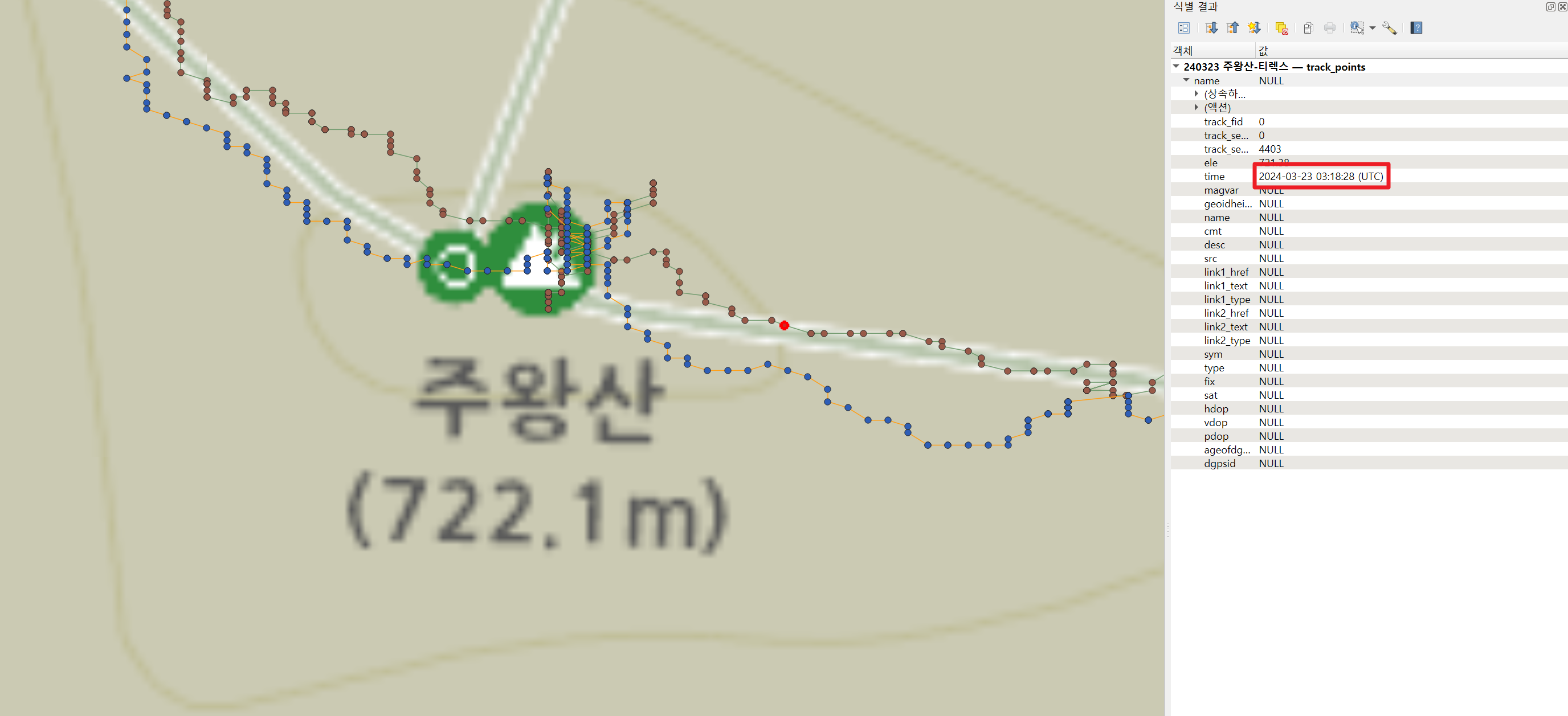 마지막으로 산길샘 어플에서도 비슷한 위치에서 연속된 다섯개의 점을 샘플로 추출하였고 그 측정 시각은 다음과 같습니다.
