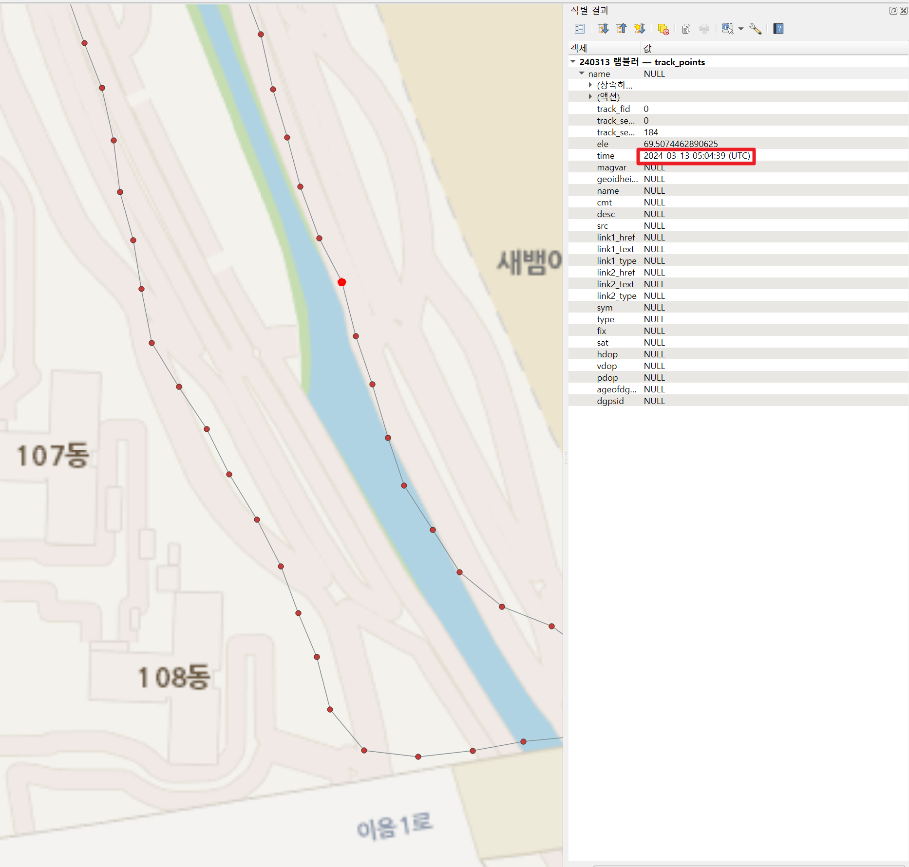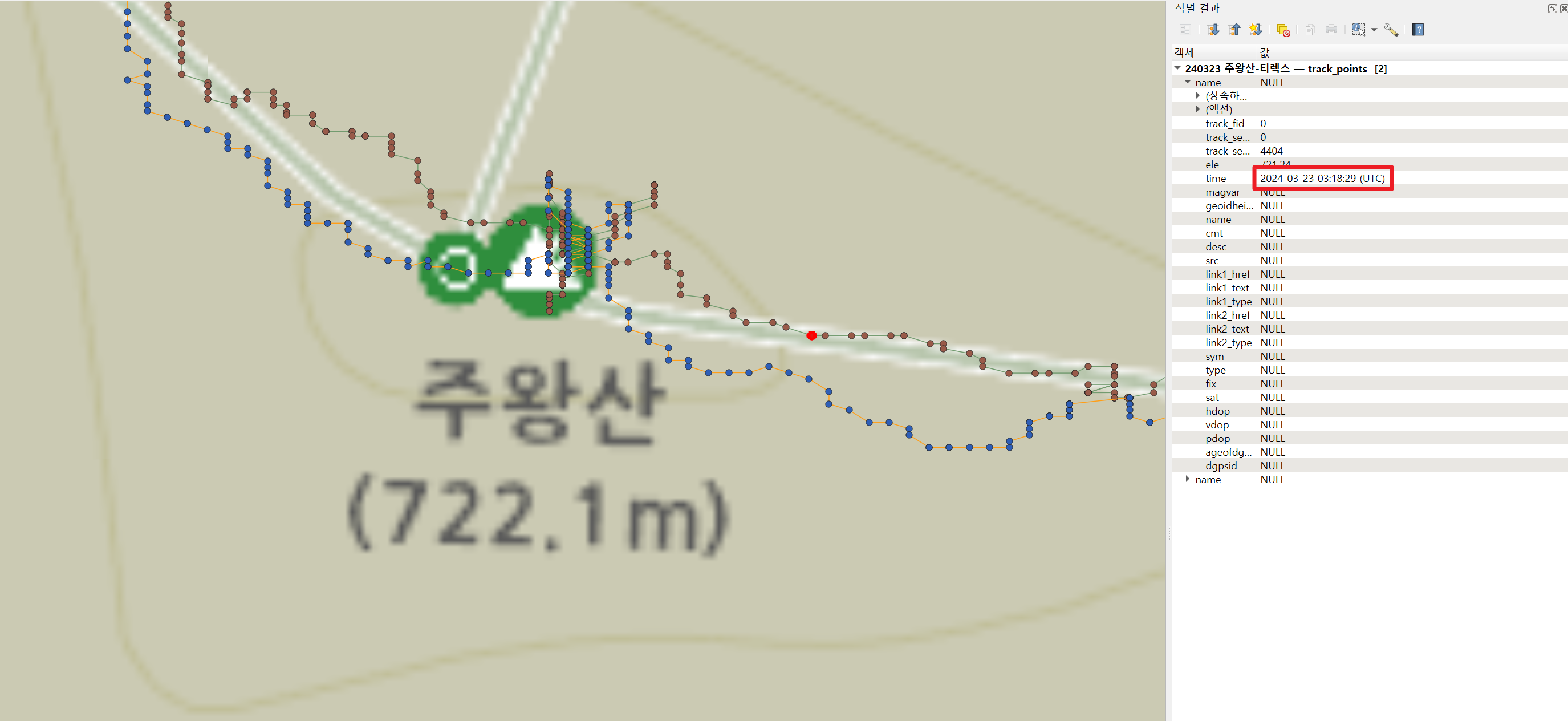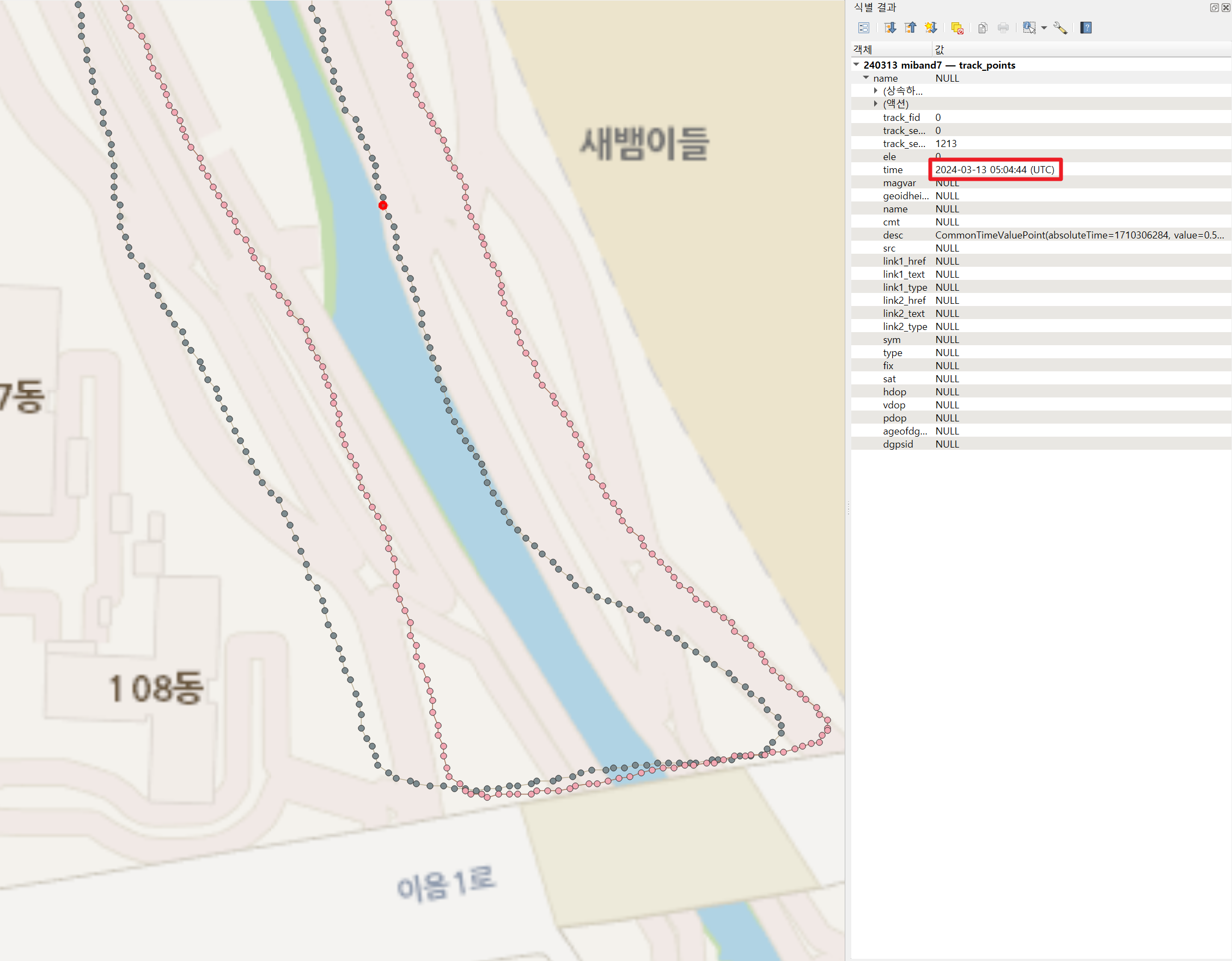 각각의 측정값을 선택하면(붉은점) 우측에 그 좌표의 속성값이 나옵니다. 이중에서 시간(붉은색 네모)을 보면 해당 좌표가 측정된 시각이 나타납니다. 이때 UTC는 원자시계를 기준으로 한 세계 표준시를 의미하며, 한국시간은 UTC 시간에 9시간을 더한 시간이 됩니다. 따라서 한국에서 새벽 5시에 운동을 한 것이 아니라 9시간을 더한 오후 2시(5시+9시=14시)에 운동한 것입니다.