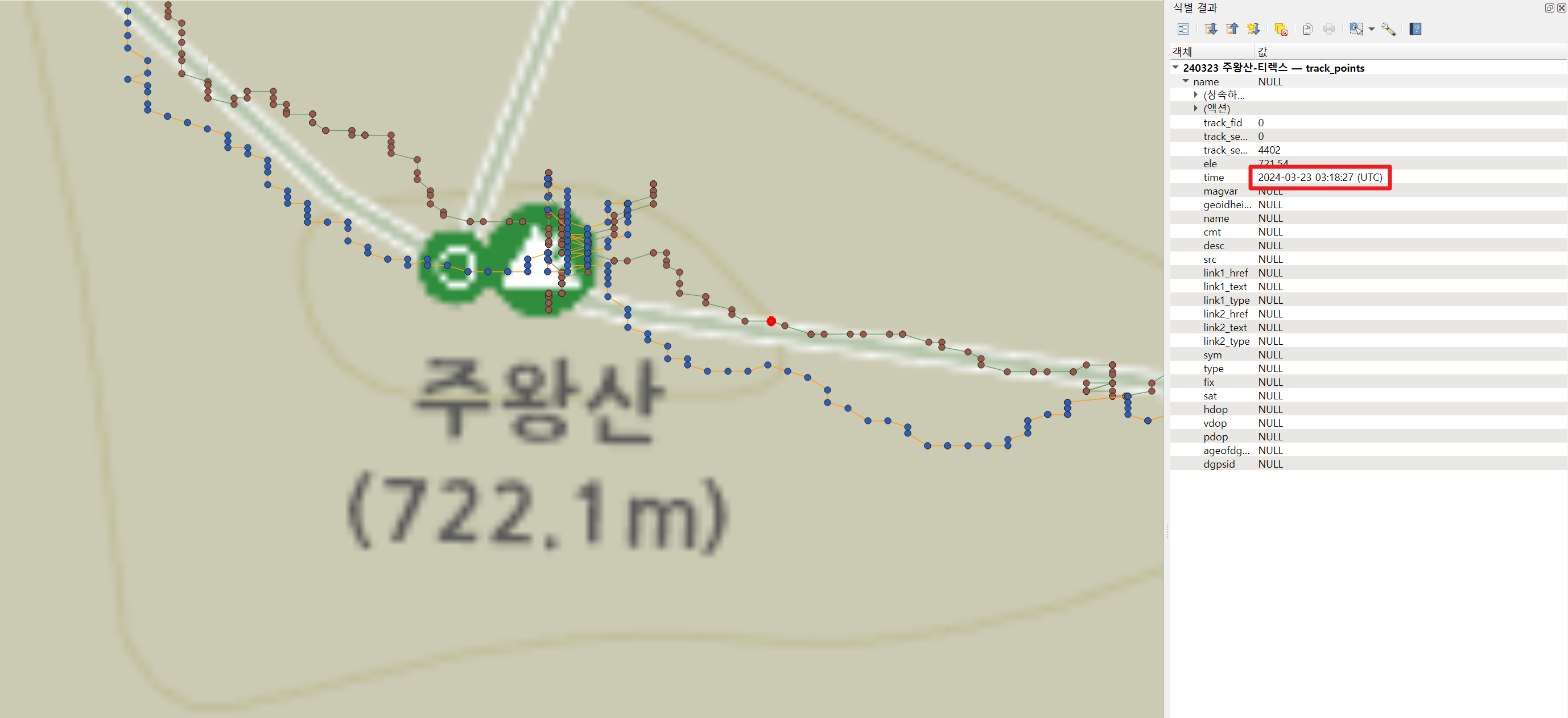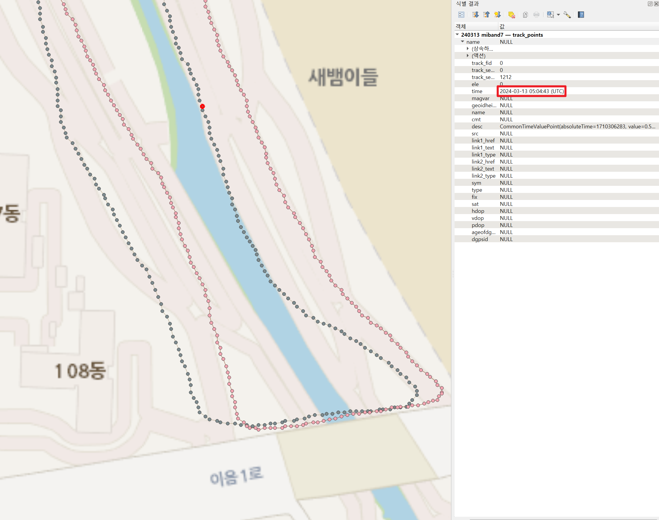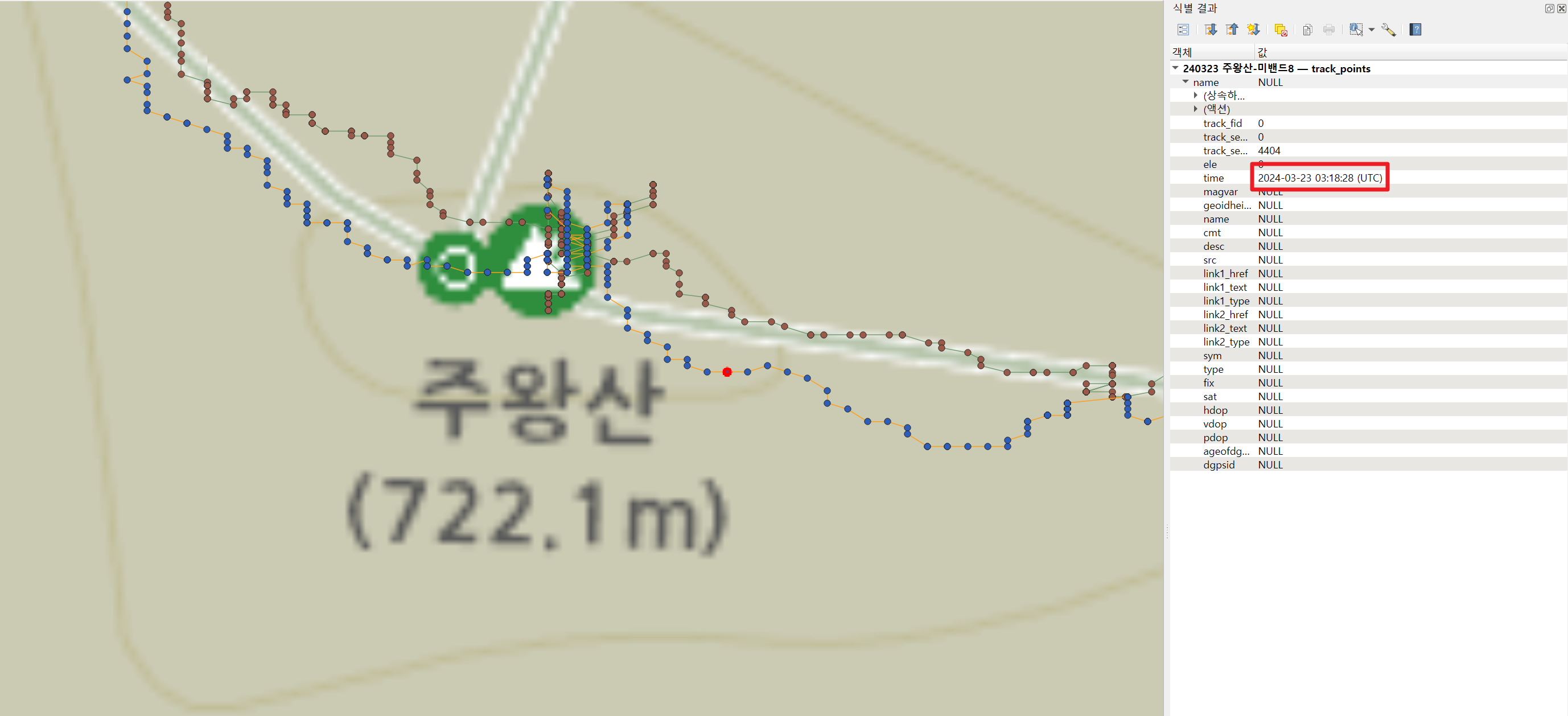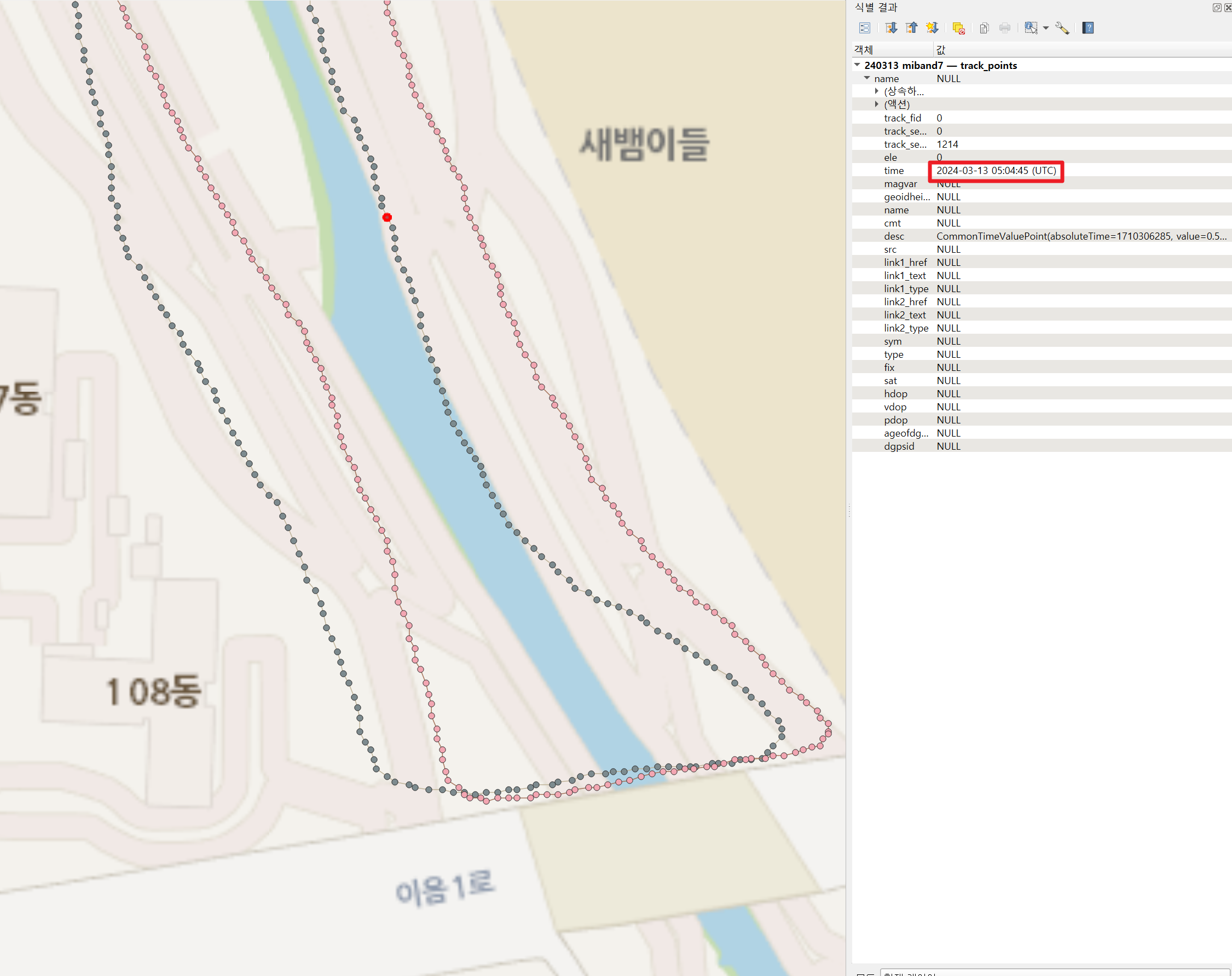 각각의 측정값을 선택하면(붉은점) 우측에 그 좌표의 속성값이 나옵니다. 이중에서 시간(붉은색 네모)을 보면 해당 좌표가 측정된 시각이 나타납니다. 이때 UTC는 원자시계를 기준으로 한 세계 표준시를 의미하며, 한국시간은 UTC 시간에 9시간을 더한 시간이 됩니다. 따라서 한국에서 새벽 5시에 운동을 한 것이 아니라 9시간을 더한 오후 2시(5시+9시=14시)에 운동한 것입니다.