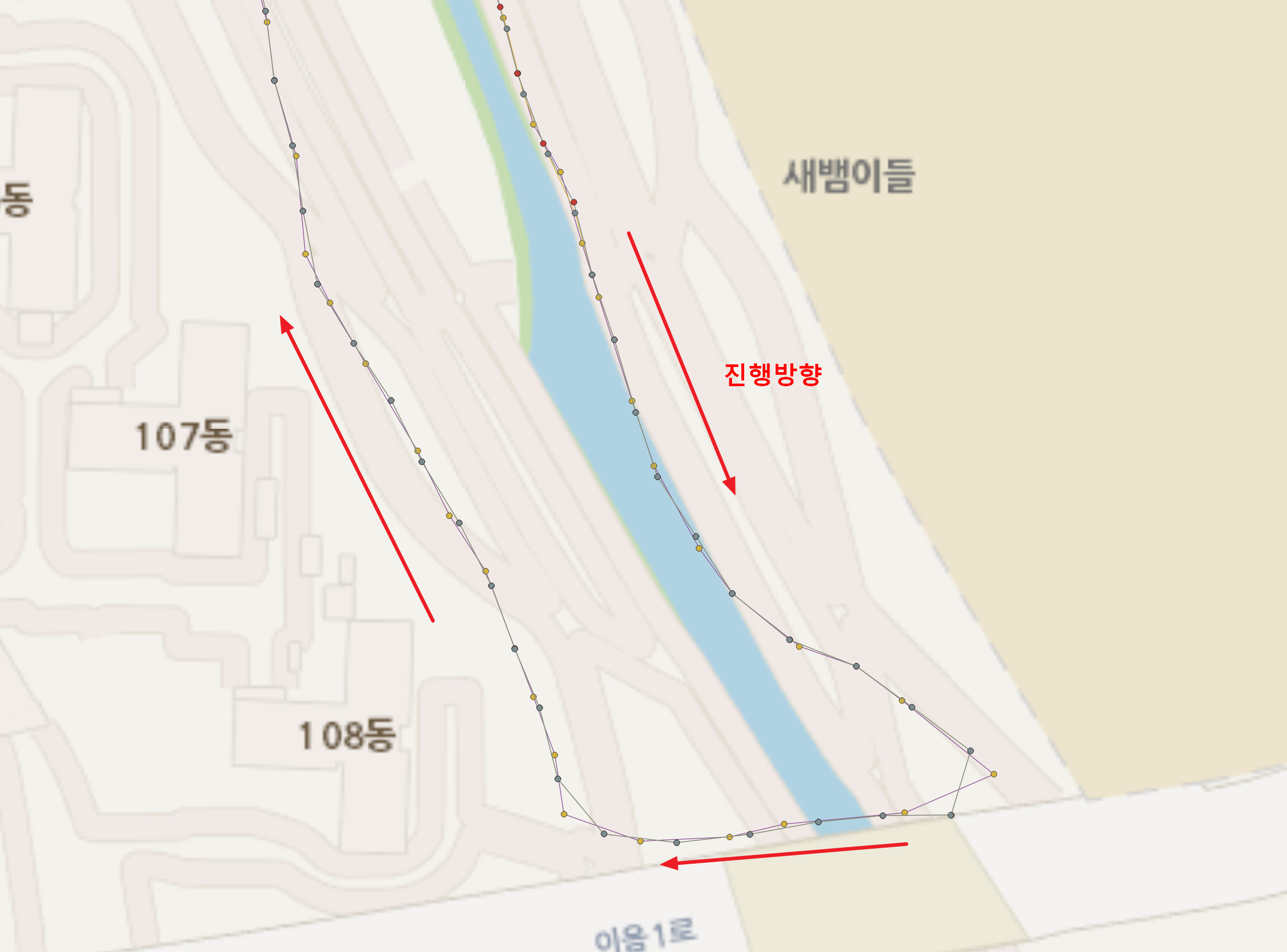 아랫쪽 경로를 확대하여 캡쳐한 모습인데 각각의 등산 어플마다 측정 주기가 다르기 때문에 생성되는 좌표도 다릅니다. 동일한 핸드폰의 GPS를 사용했음에도 불구하고 미세한 오차가 발생합니다. 이제부터 세부적인 데이터를 확인해 보겠습니다.