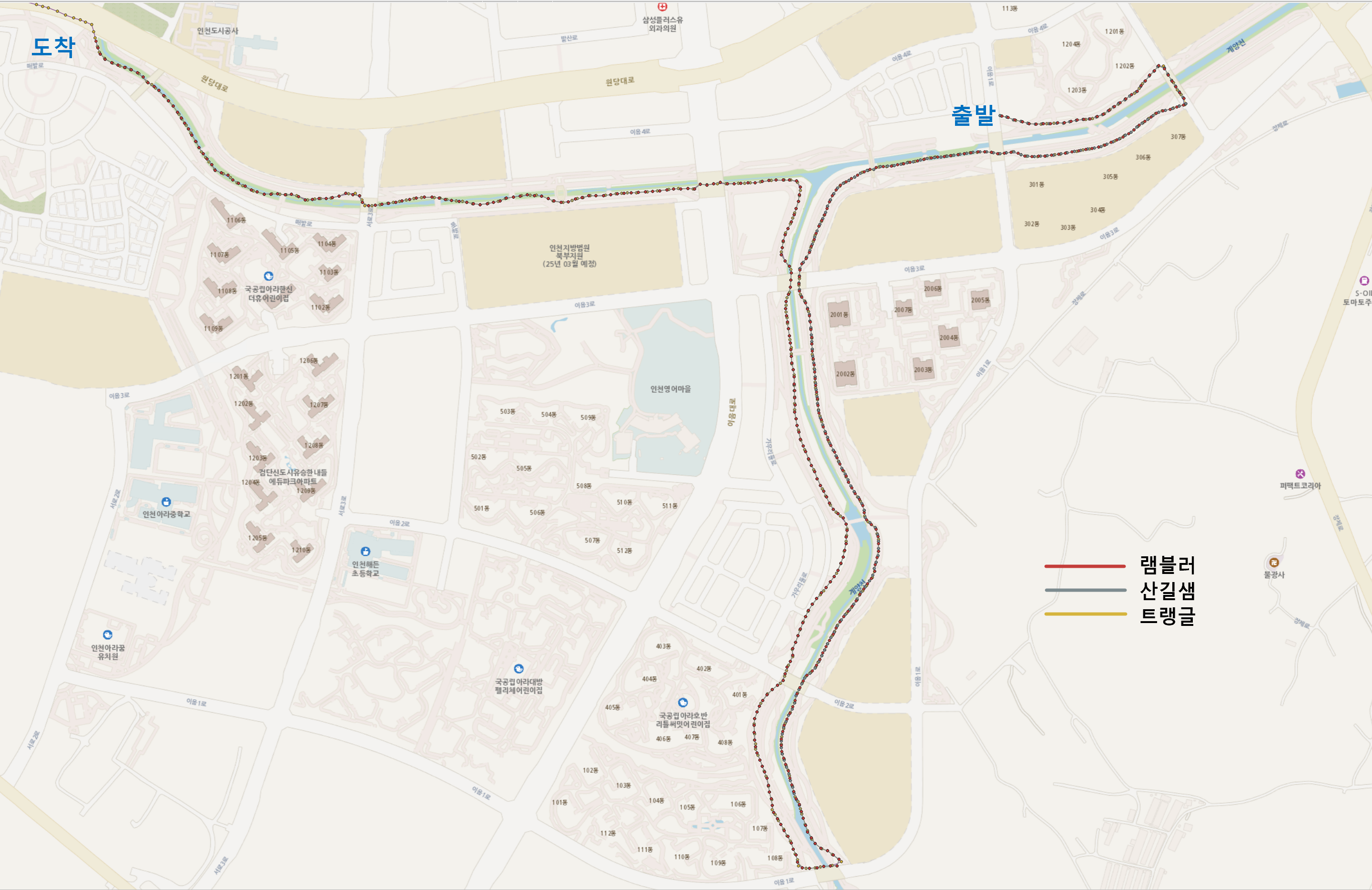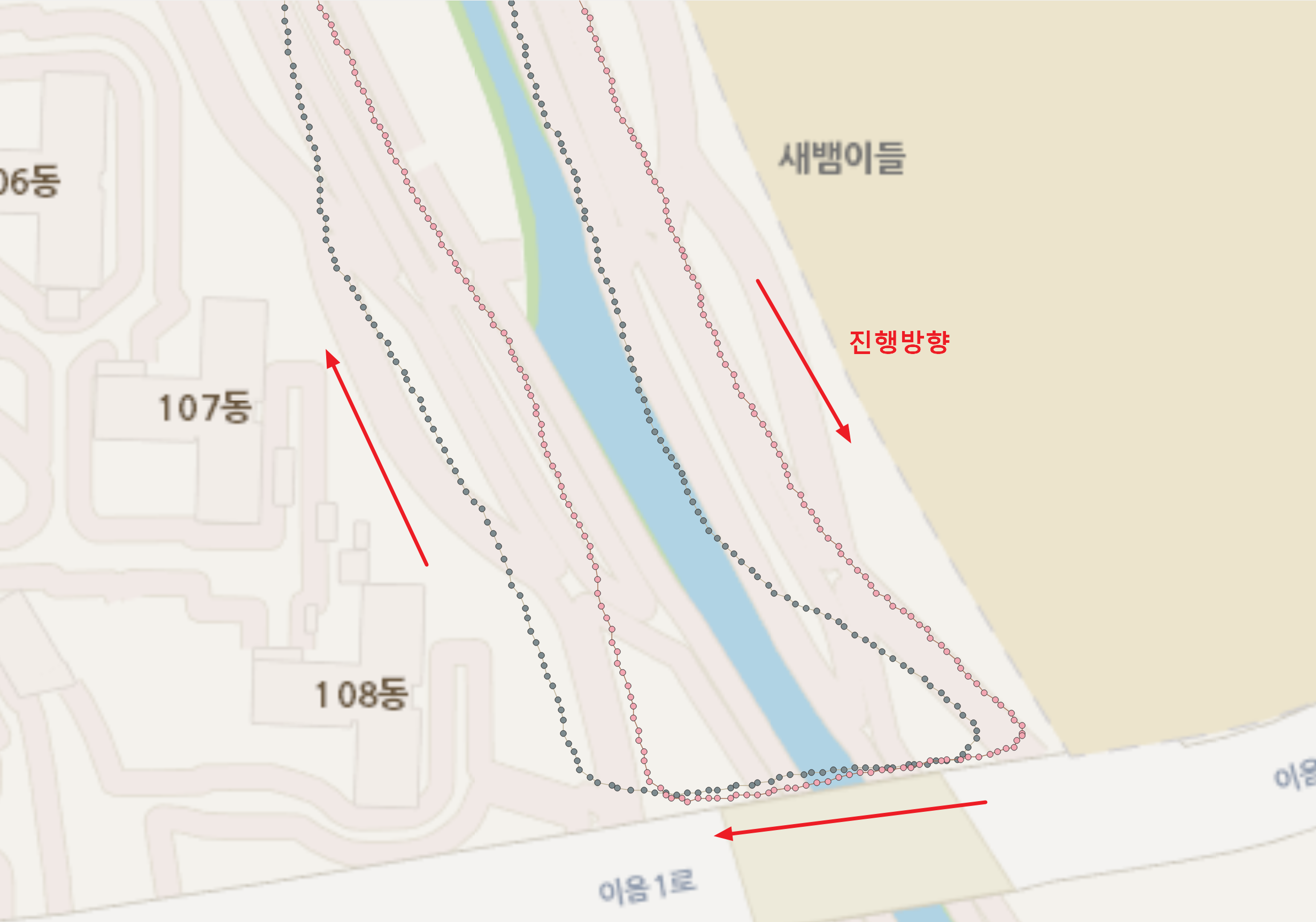 웨어러블 기기 2개의 전체 경로입니다. 같은 날 같은 시간 측정한 것이므로 동일한 경로입니다.
