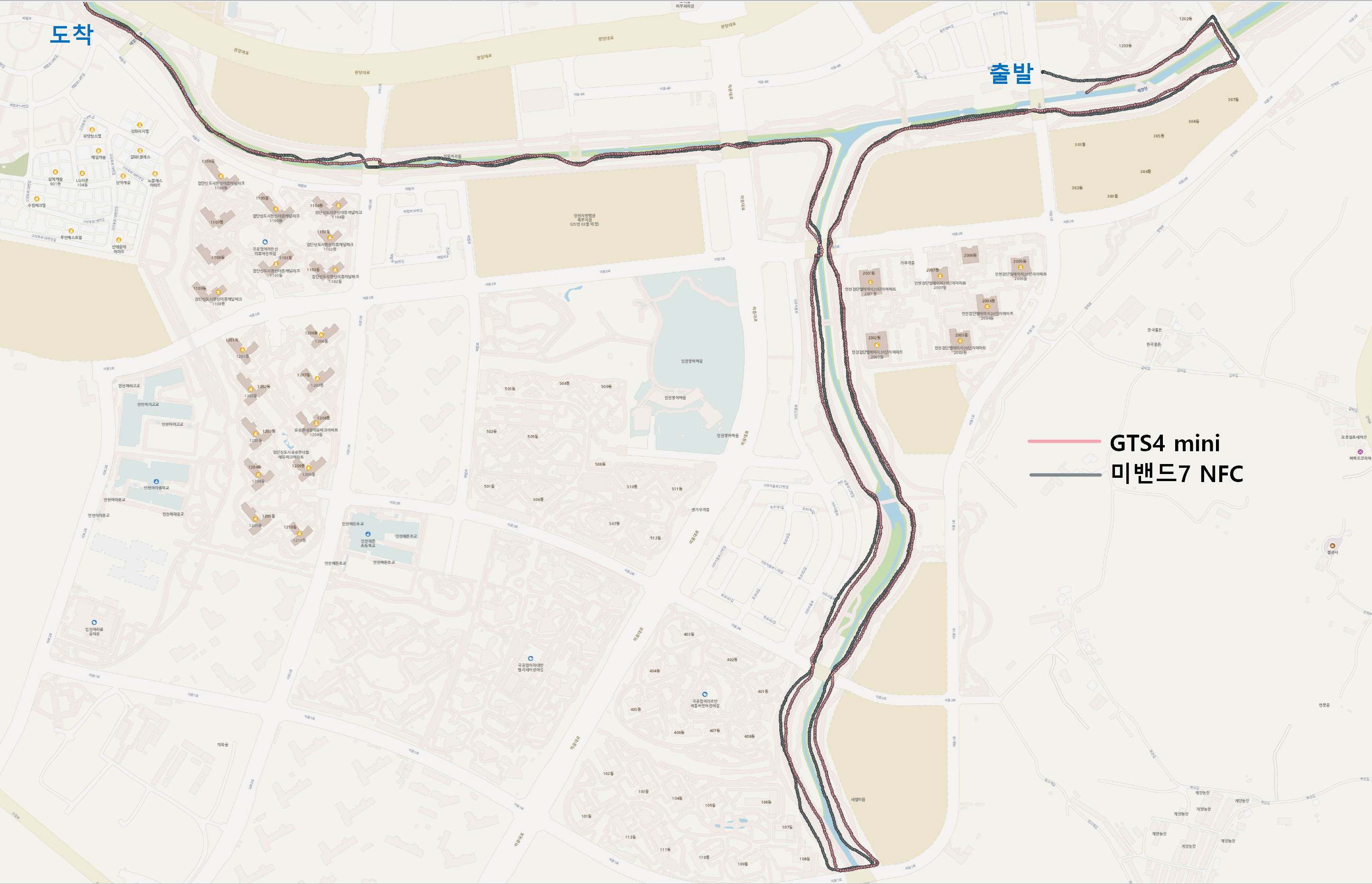 아랫쪽 부분을 확대한 모습입니다. 경로를 보면 양팔에 따로 착용했다 하더라도 그 폭을 훨씬 벗어나는 오차(약 3~5m)가 발생했습니다. 그 이유는 핸드폰 등산 어플과 달리 웨어러블 기기는 자체에 내장된 GPS를 사용하여 측정 좌표가 달라지기 때문입니다.